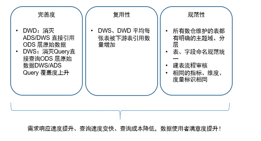数仓设计得好不好,主要体现在三个方面,完善度、复用性和规范性。数仓设计一般采用的是面向主题域的分层设计,对于 ODS 层保存的是业务原始数据,DWD 保存的是经过清洗的明细数据,DWS 是经过轻度聚合的汇总数据,ADS 或者 DM 是应用层、集市层数据,这是一个常见的 4 层模型划分。完善度的意思就是对于使用者而言,“要啥有啥”,对于不同分层,完善度的衡量方式也是有区别的,对于明细层,如果数仓中存在汇总层(DWS)数据直接引用 ODS 原始数据的情况,我们称之为跨层引用,这就说明细层数据建设是有缺失的,如果其他汇总层也要使用相同的数据,都从 ODS 层去引用,就存在重复清洗的问题。对于汇总层数据而言,如果 Query 覆盖率比较低,说明大量的查询都是直接查询明细数据,甚至是原始数据,这就说明汇总层数据建设完善度不够,对于使用数据的人而言,查询明细数据,不仅慢,而且查询成本高,经常出现一个查询 hang 住整个集群的情况。复用性主要强调的是一个表被多个表使用的情况,复用性越高,说明数仓的设计越合理,更多的数据在数仓被复用。规范性主要是指数仓中的表、字段的命名规范统一,相同指标、维度、度量的标识是一致的。