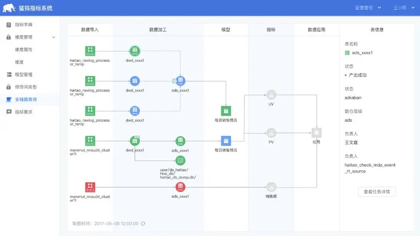 指标系统:管理指标的业务口径、计算逻辑和数据来源,通过流程化的方式,建立从指标需求、指标开发、指标发布的全套协作流程。