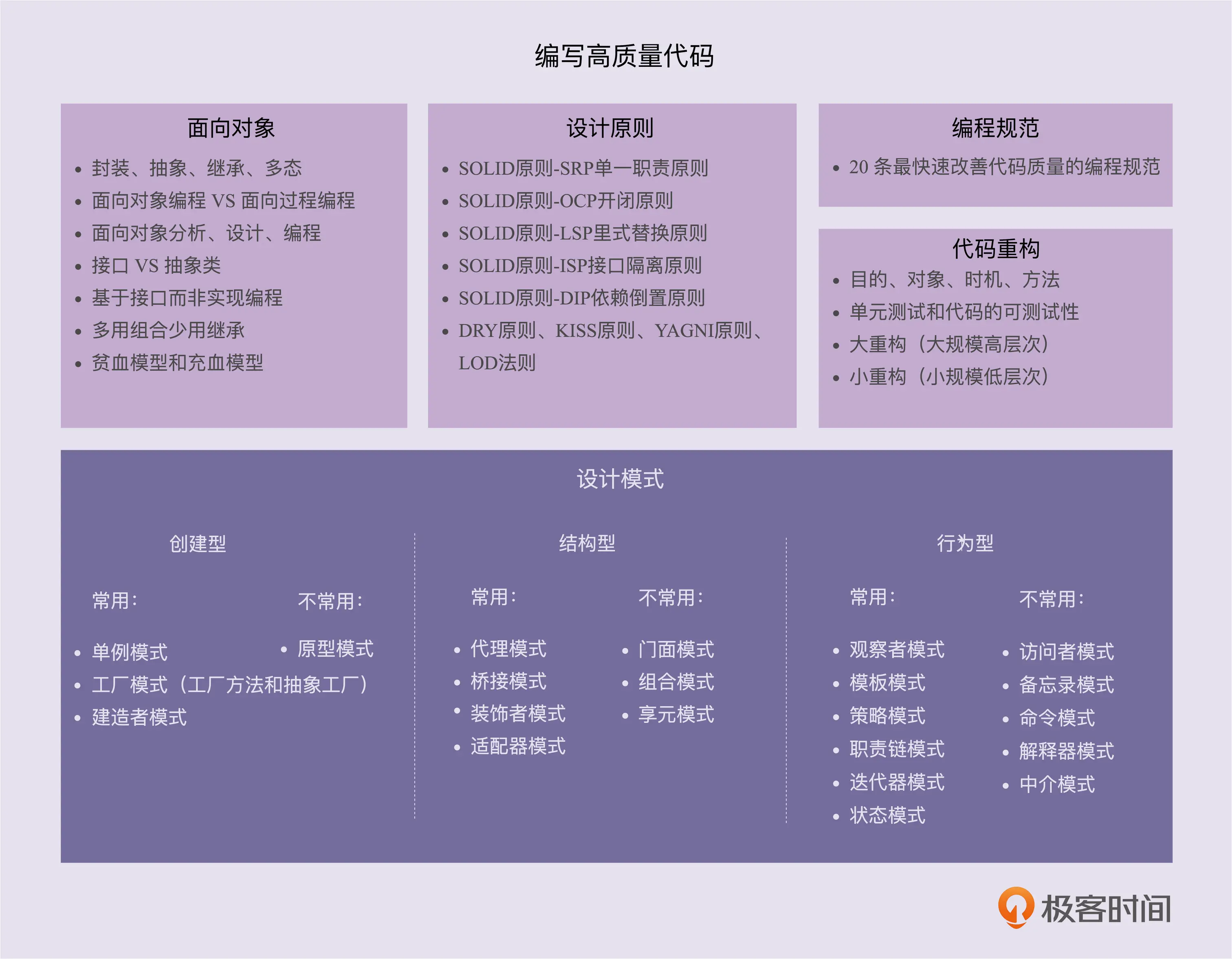 - 重构 作为保持代码质量不下降的有效手段,利用的就是面向对象、设计原则、设计模式、编码规范这些理论。