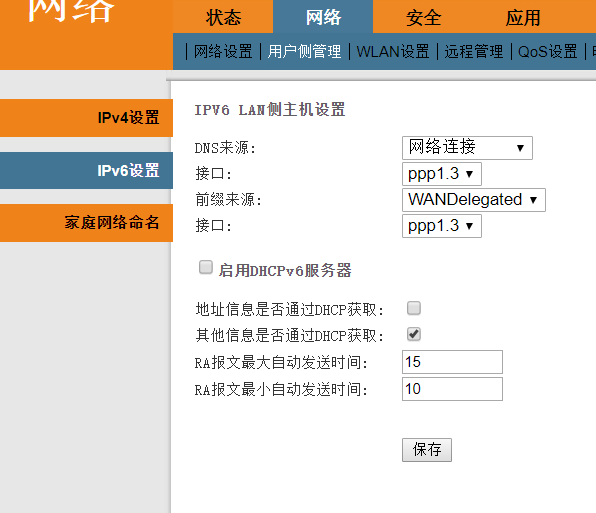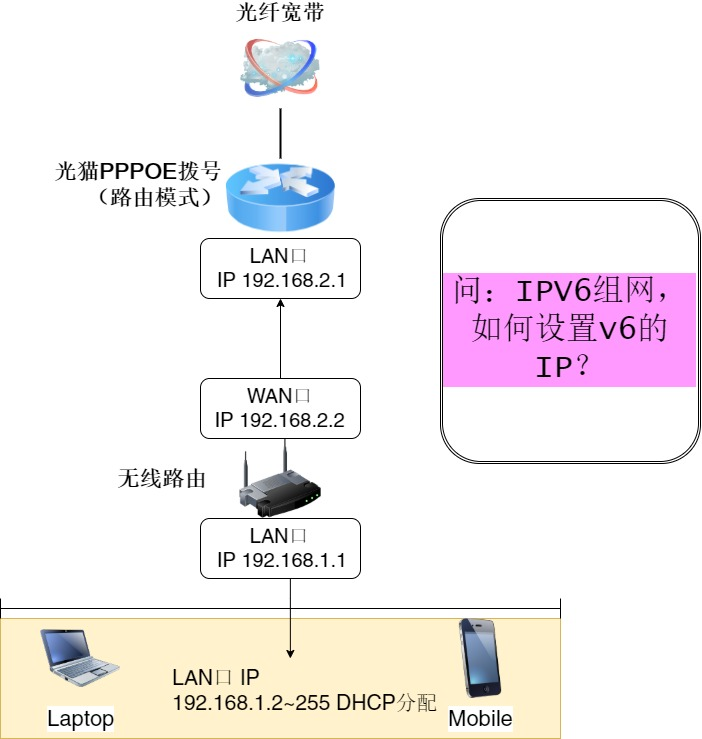 [求助] 家庭网络的 IPv6 设置 x1angli 2019-12-10 820 阅读1分钟 在目前两台路由器串联/级联(cascading)的情况下,IPv4访问一切正常,IPv6访问貌似有问题。 如何设置这两台路由器的 IPv6 (如IP段,DHCP的范围等)? 图1:家庭网络拓扑图 图2:光猫的LAN口的IPv6设置界面 图3:无线路由的IPv6设置界面
