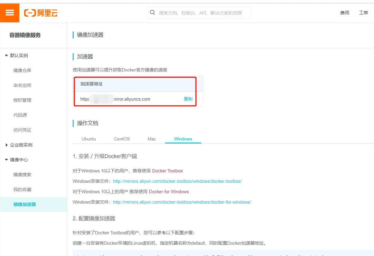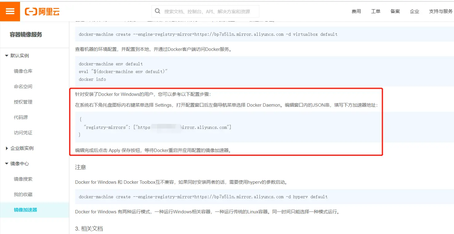 Docker镜像加速-配置阿里云镜像仓库 心晨 2019-12-10 254 阅读1分钟 Docker默认远程仓库是https://hub.docker.com/, 下载东西太慢了 所以我们建议配置国内镜像,比如阿里云的 配置步骤如下: 1、登录进入阿里云镜像服务中心,获取镜像地址 2、按照阿里云的提示,对应的配置就行了。我装的是Docker Desktop