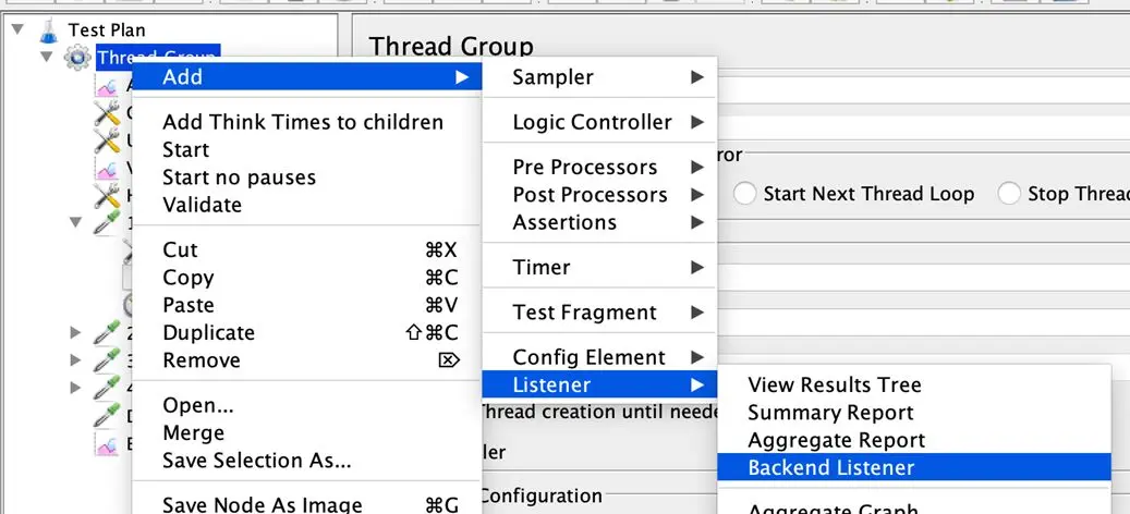 在JMeter中添加 Backend Listener 组件,用于收集数据并发送给influxdb。