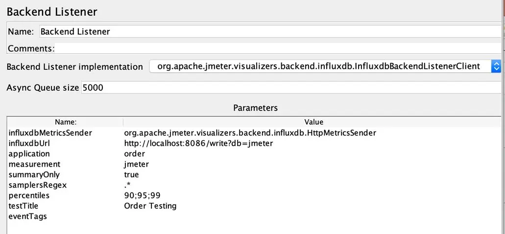 在influxdbURL中将实际的influxdb hostname填写进去,在application中填写 order,在testTitle中填写 Order Testing,其余配置保持不变