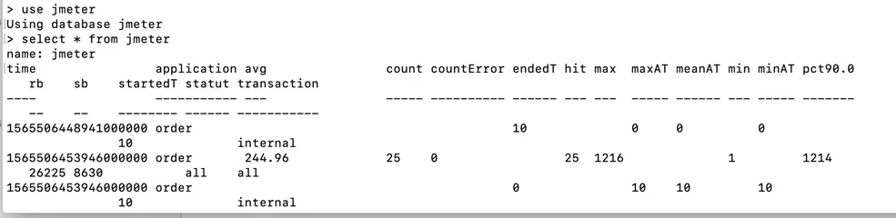 运行JMeter , 然后在 influxdb中检验是否已经能够接受到数据。在influxdb 命令台中使用查询语句,检查是否已经能够收到数据