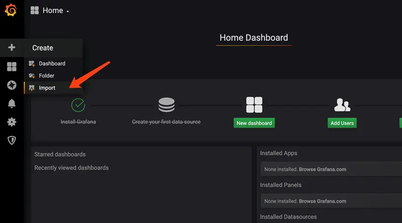 在Grafana 内导入JMeter Dashboard,进入Home Dashboard 页面,选择Import