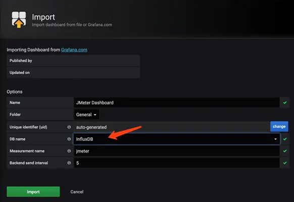 在 DB name 中选择 InfluxDB,单击 Import 按钮完成 Dashboard 导入