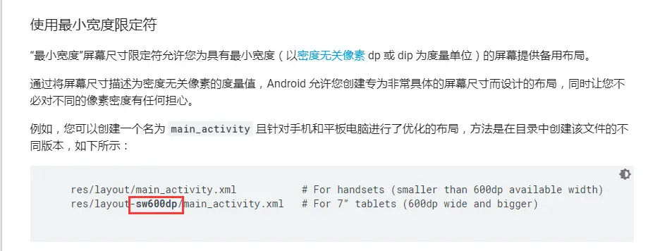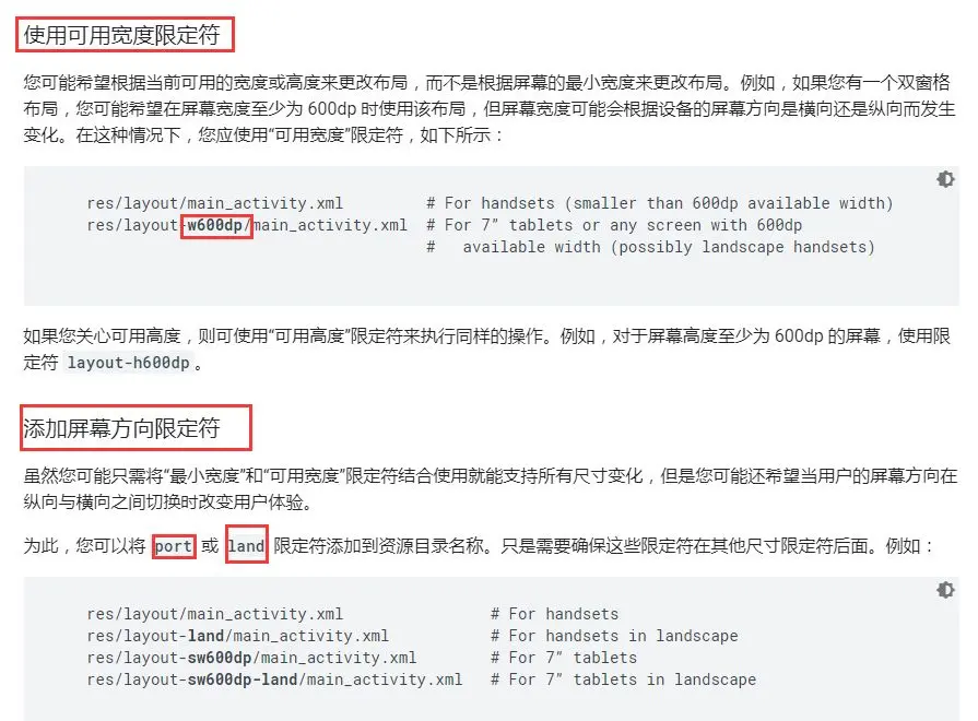 **限定符: ** 在原本的 layout后面加上横杠,然后加上限定名。形成 layout-XXX的形式,具体规则请参考谷歌官网: developer.android.google.cn/training/mu…, 重点摘录如下: