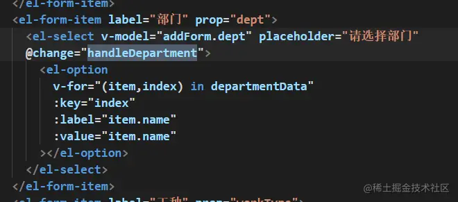 handleDepartment(val) { let arr = [];arr = this.departmentData.filter(item => item.name === val); this.addForm.deptId = arr[0].id; }