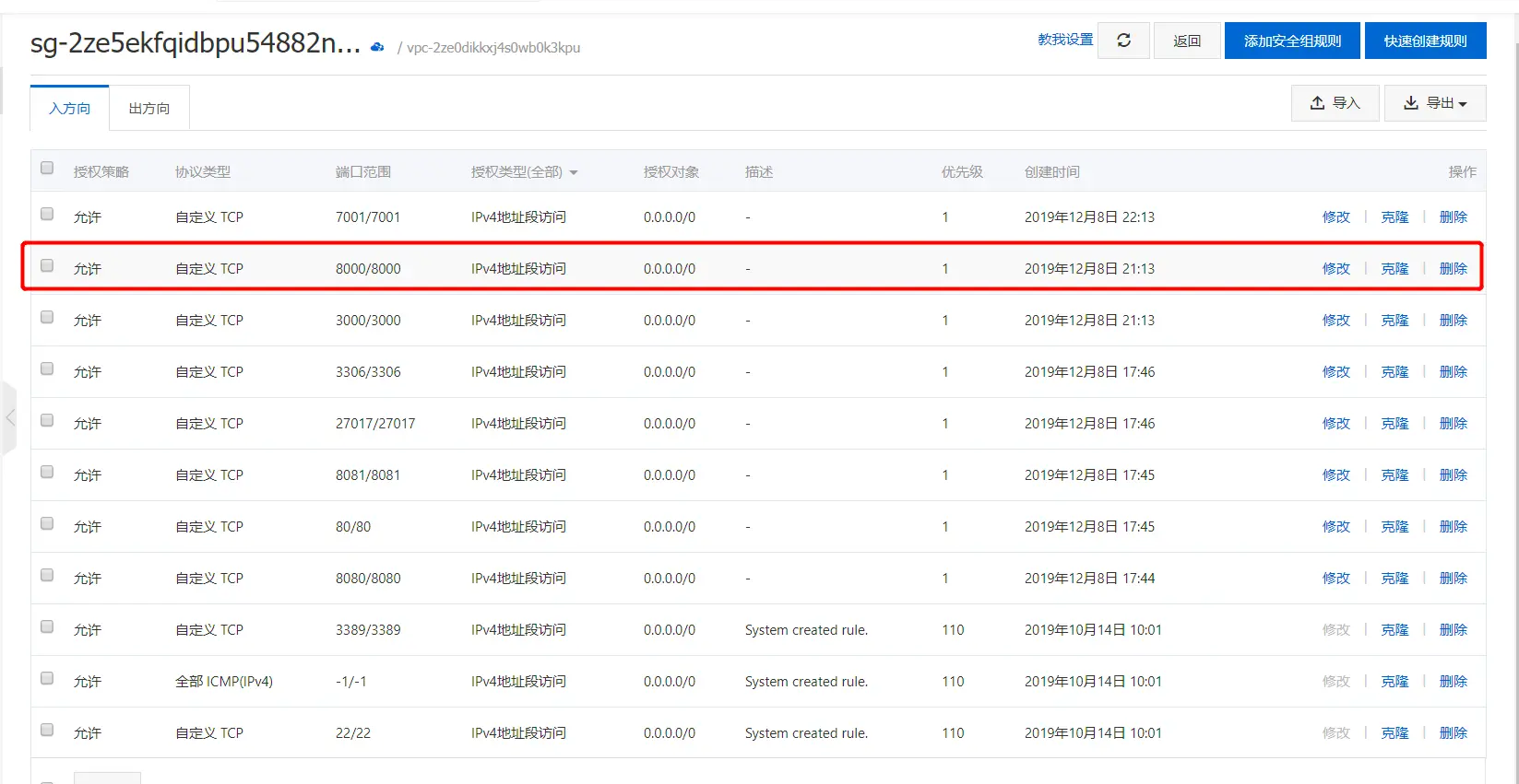 中间有很多的曲折 总是发布不成功最后发现是自己的端口没配 将8000 端口配置进安全组 点击添加安全组 将想要的端口配置进去。