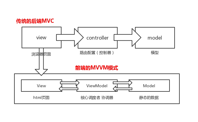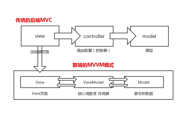 在传统的mvc中除了model和view以外的逻辑都放在了controller中,导致controller逻辑复杂难以维护,在mvvm中view和model没有直接的关系,全部通过viewModel进行交互