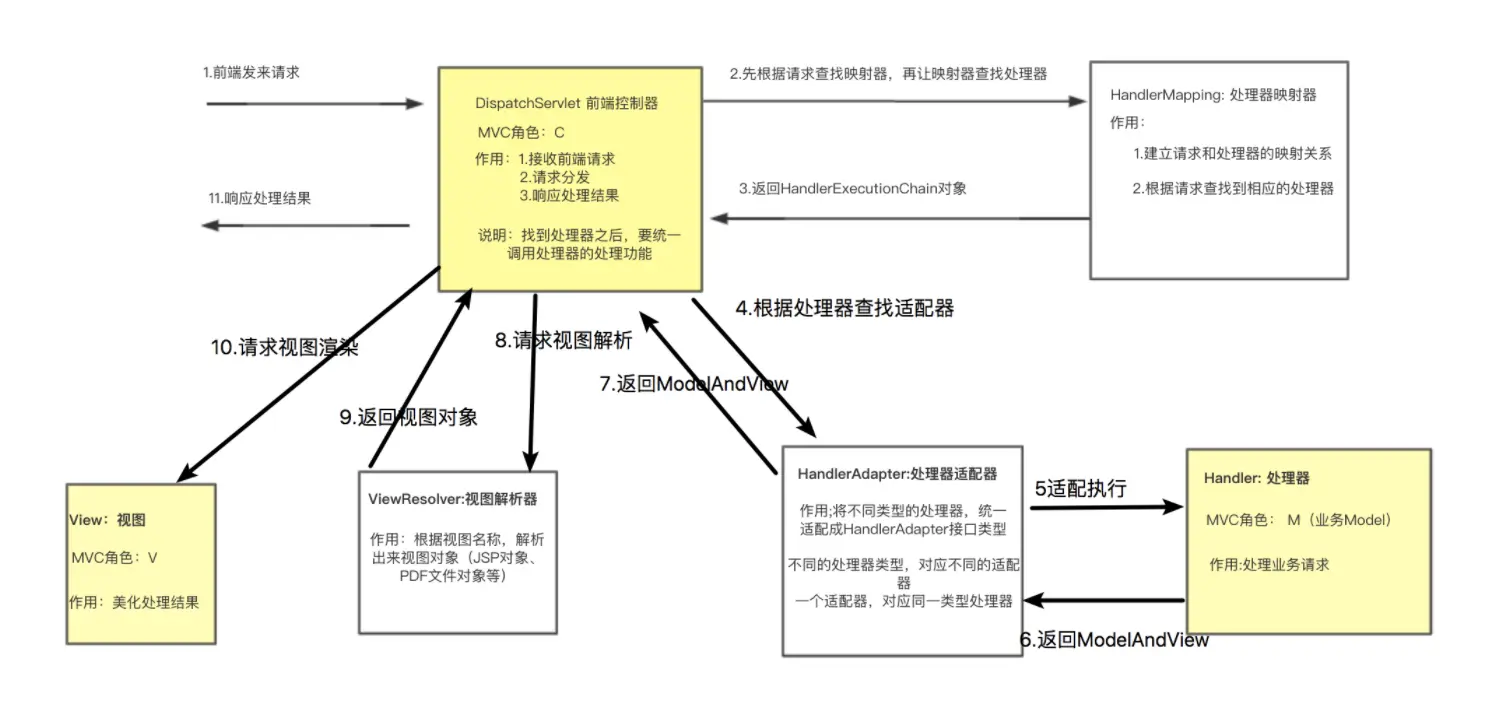 SpringMVC这里就给每个handler对应一个相应的适配器,比如针对Controller实现的handler对应的是SimpleControllerHandlerAdapter适配器,由SimpleControllerHandlerAdapter适配器调用Controller处理器处理相关逻辑,每个handler的处理逻辑不一样,以后再新增一个handler的时候,只用新增相应的适配器就可以了,这完美的解决了这个问题。希望读者能细品其中的设计思想。