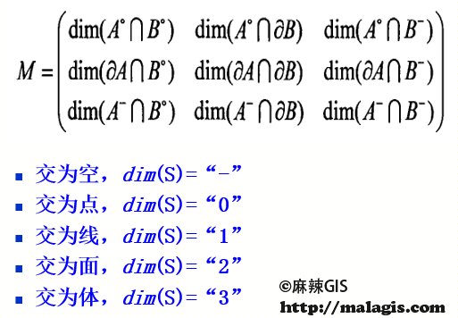在一个平面R2上,两个对象A和B之间的二元拓扑关系要基于以下的相交情况:A的内部(A°)、边界(αA)和外部(A-)与B的内部(B°)、边界(αB)和外部(B-)之间的交。