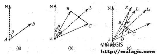 点A与点B的空间方向关系可以用向量AB与正北方向的夹角(顺时针)来描述。