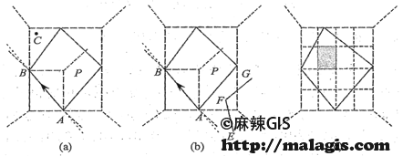 (b)方向线PS和PE重和,说明点A被线L包围,这是全域空间方向关系,点A与P1、P2、P3、P4(中点)的连线定义了点A与不同直线段的局域空间方向关系。
