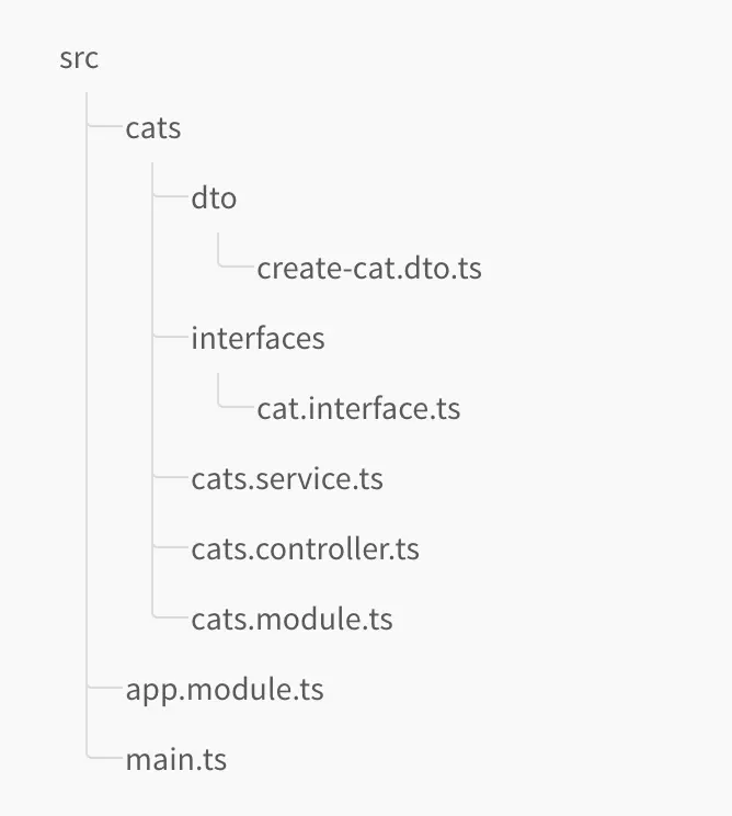 如图,这是官网示例项目的目录结构,可以发现它和我们传统的node项目有些不同,在目录结构我们就能看到模块化影子。先是主入口main.ts,后是主模块app.module.ts,最后是挂载在app中的cat模块。