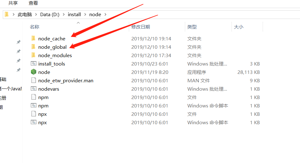 - 1,首先在d盘node的安装目录下配置创建两个文件如下图