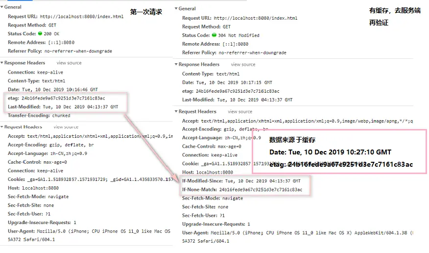 当缓存过期,再验证。客户端将缓存的数据实体标签If-None-Match发往服务端,服务端将用If-None-Match 与 ETag做对比。
