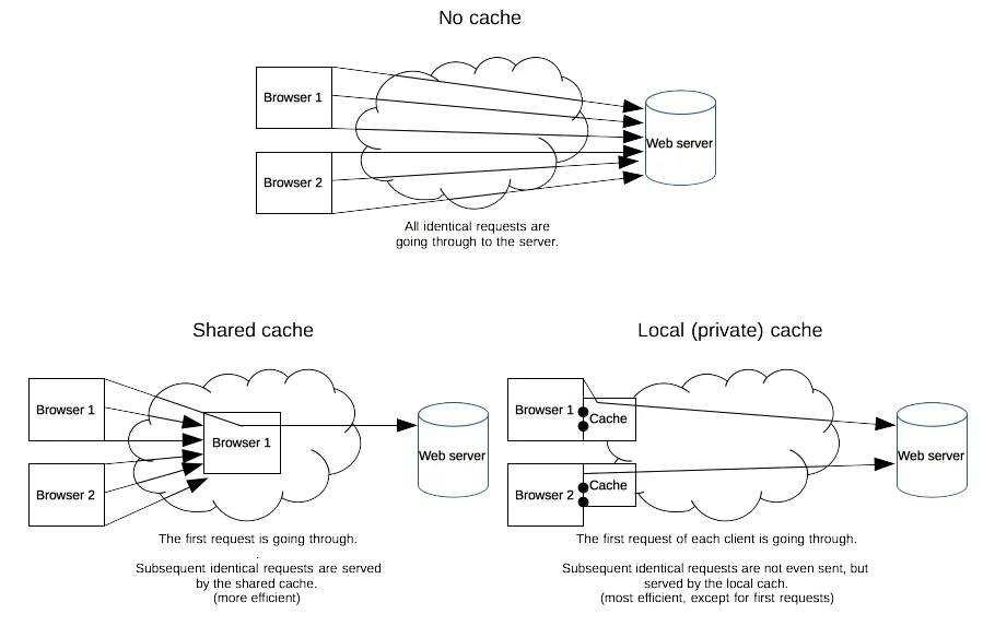 共享缓存:当用户Browser1请求资源,经过缓存服务器,缓存服务器也没有资源,向原始服务器请求资源。得到资源后,缓存服务器缓存资源并返还数据给Browser1。当用户Browser2请求相同资源时,缓存服务器有资源,且能用,就直接返还数据给Browser2,不再向原始服务器发起请求。