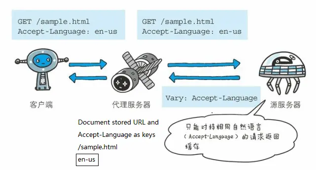 上述例子是简单描述存在代理服务器的请款,浏览器通常不实现针对每个URL存储多个变体的功能。
