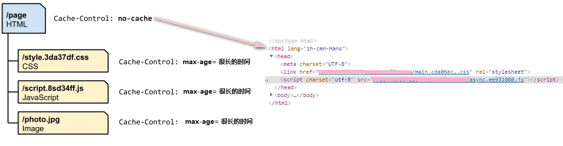 在HTML内挂载的 js css png 都带上 文件唯一标识字符串。任意文件变化,url 就会变化,从而引起HTML 文件变化。下次请求资源就会更新。