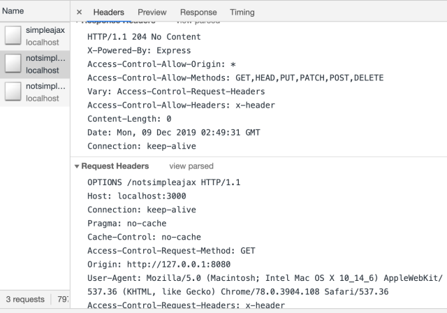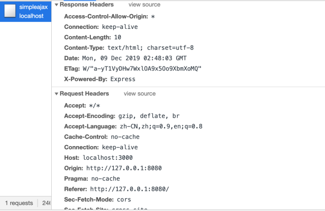 分别点击跨域简单请求和跨域非简单请求(request中加了header:X-header=notsimple),控制面板network会看到: