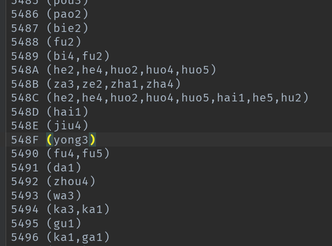 函数先将汉字转成GBK编码,再与这些声母临界的字符编码进行比较,确定了第一个拼音的区间,比如在B0C5->芭 和 B2C1->擦 中间的就是b开头,挺巧妙的。