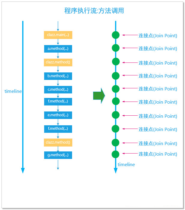 通常面向对象的程序,代码都是按照时间序列纵向展开的,而他们都有一个共性:即都是已方法调用作为基本执行单位展开的。将方法调用当做一个连接点,那么由连接点串起来的程序执行流就是整个程序的执行过程。