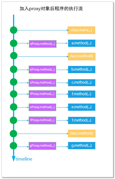 我们假设在我们的Java代码里,都为实例对象通过代理模式创建了代理对象,访问这些实例对象必须要通过代理,那么,加入了proxy对象的Java程序执行流会变得稍微复杂起来。我们来看下加入了proxy对象后,Java程序执行流的示意图:
