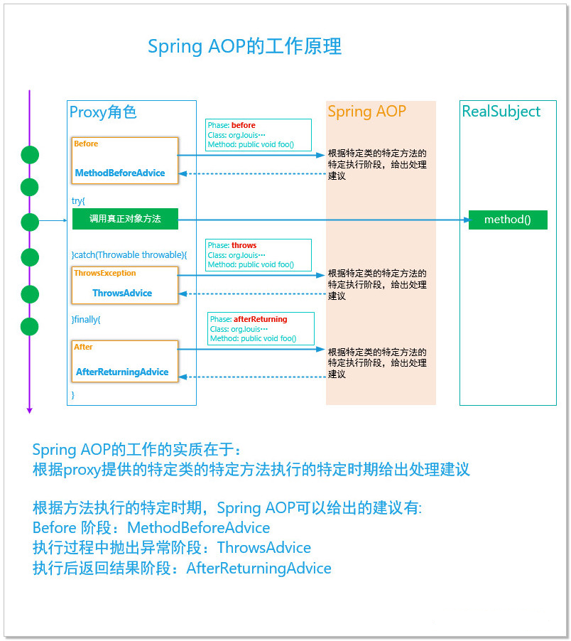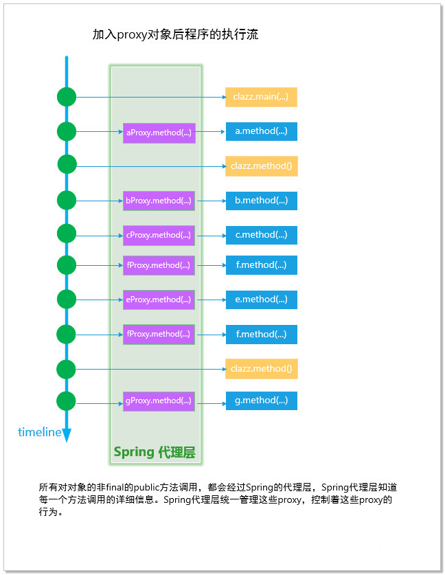 加入了代理模式的Java程序执行流,使得所有的方法调用都经过了代理对象。对于Spring AOP框架而言,它负责控制着真个容器内部的代理对象。当我们调用了某一个实例对象的任何一个非final的public方法时,整个Spring框架都会知晓。