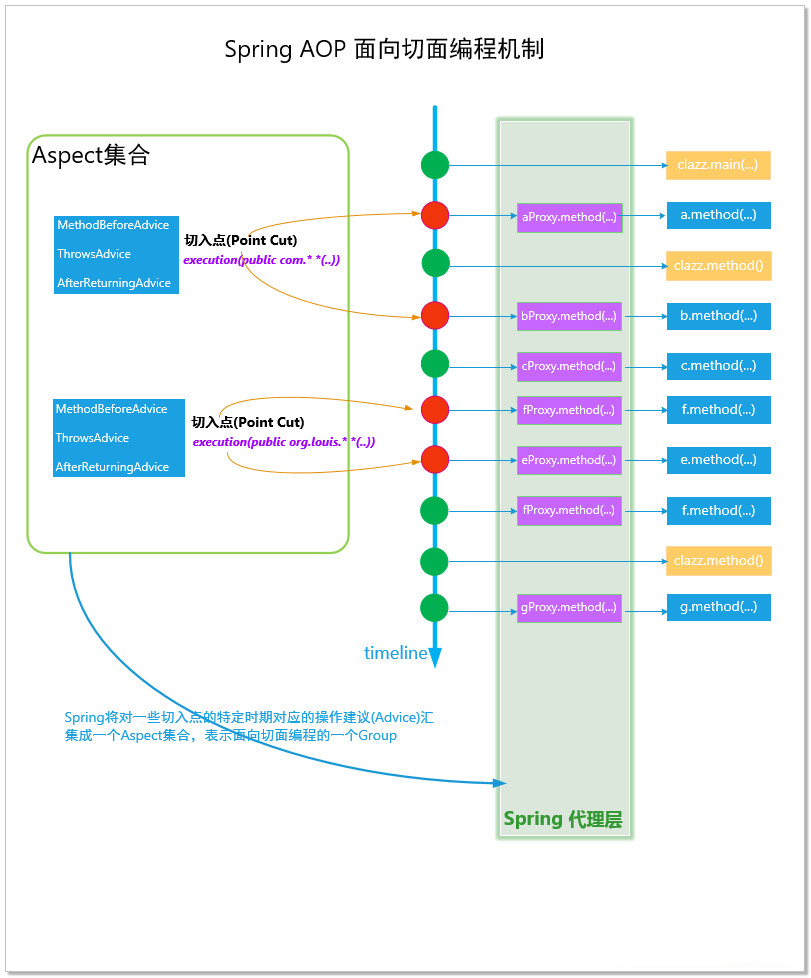 基于时间序列,我们可以将方法调用排成一条线。而每个方法调用则可以看成Java执行流中的一个节点。这个节点在AOP的术语中,被称为Join Point,即连接点。一个Java程序的运行的过程,就是若干个连接点连接起来依次执行的过程。