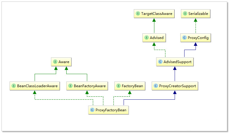 Spring 使用工厂Bean模式创建每一个Proxy,对应每一个不同的Class类型,在Spring中都会有一个相对应的ProxyFactoryBean.以下是ProxyFactoryBean的类图。