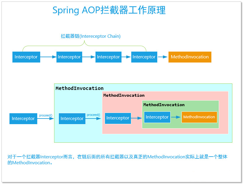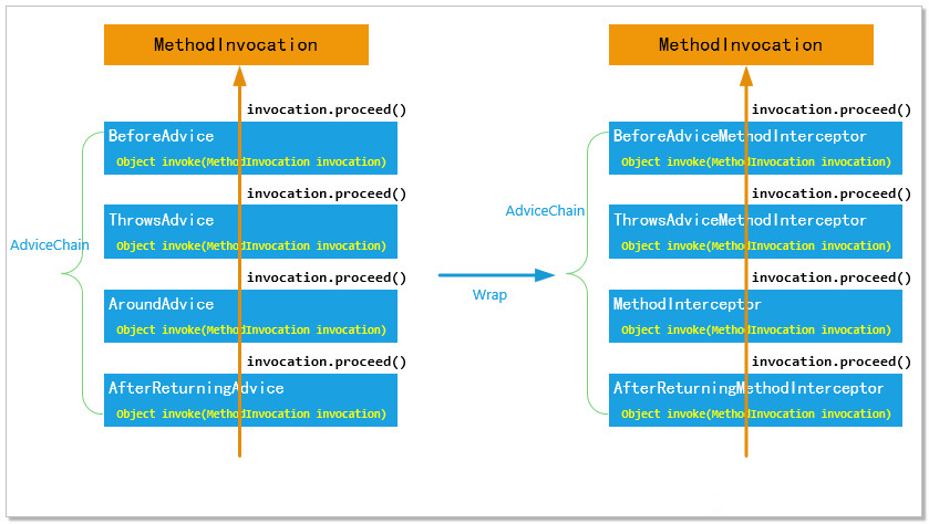 JdkDynamicAopProxy和CglibAopProxy只是创建代理方式的两种方式而已,实际上我们为方法调用添加的各种Advice的执行逻辑都是统一的。在Spring的底层,会把我们定义的各个Adivce分别包裹成一个MethodInterceptor,这些Advice按照加入Advised顺序,构成一个AdivseChain.