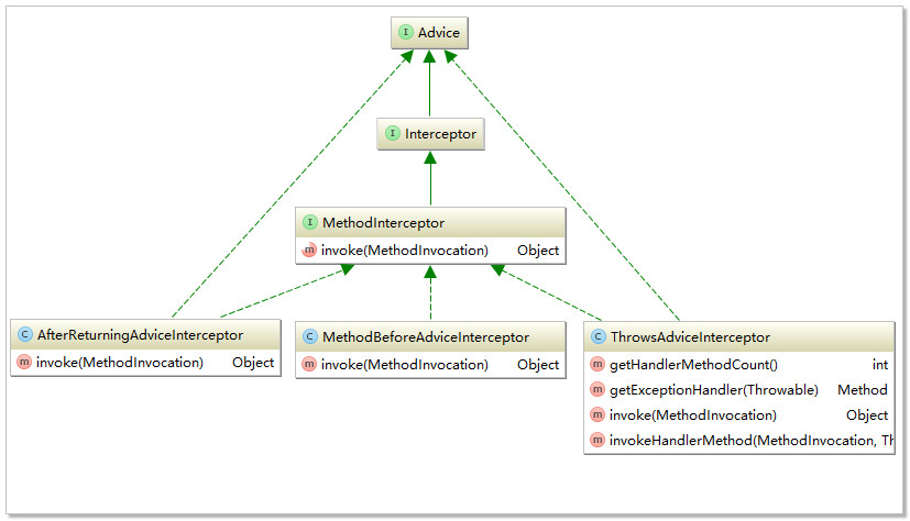 各种Advice本质而言是一个方法调用拦截器,现在让我们看看各个Advice拦截器都干了什么?
