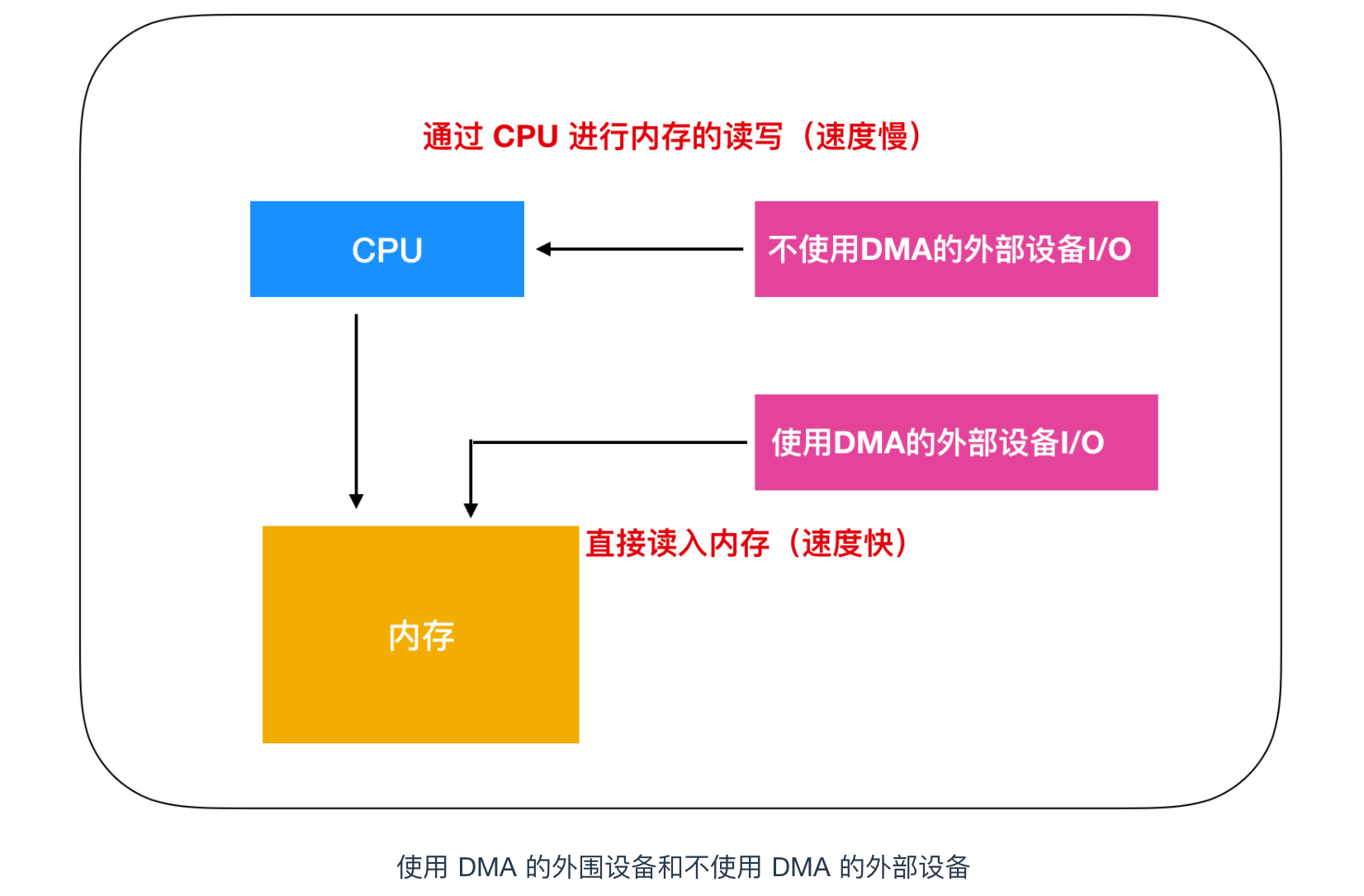上面我们介绍了 I/O 处理和中断的关系,下面我们来介绍一下另外一个机制,这个机制就是 DMA(Direct Memory Access)。DMA 是指在不通过 CPU 的情况下,外围设备直接和主存进行数据传输。磁盘等硬件设备都用到了 DMA 机制,通过 DMA,大量数据可以在短时间内实现传输,之所以这么快,是因为 CPU 作为中介的时间被节省了,下面是 DMA 的传输过程