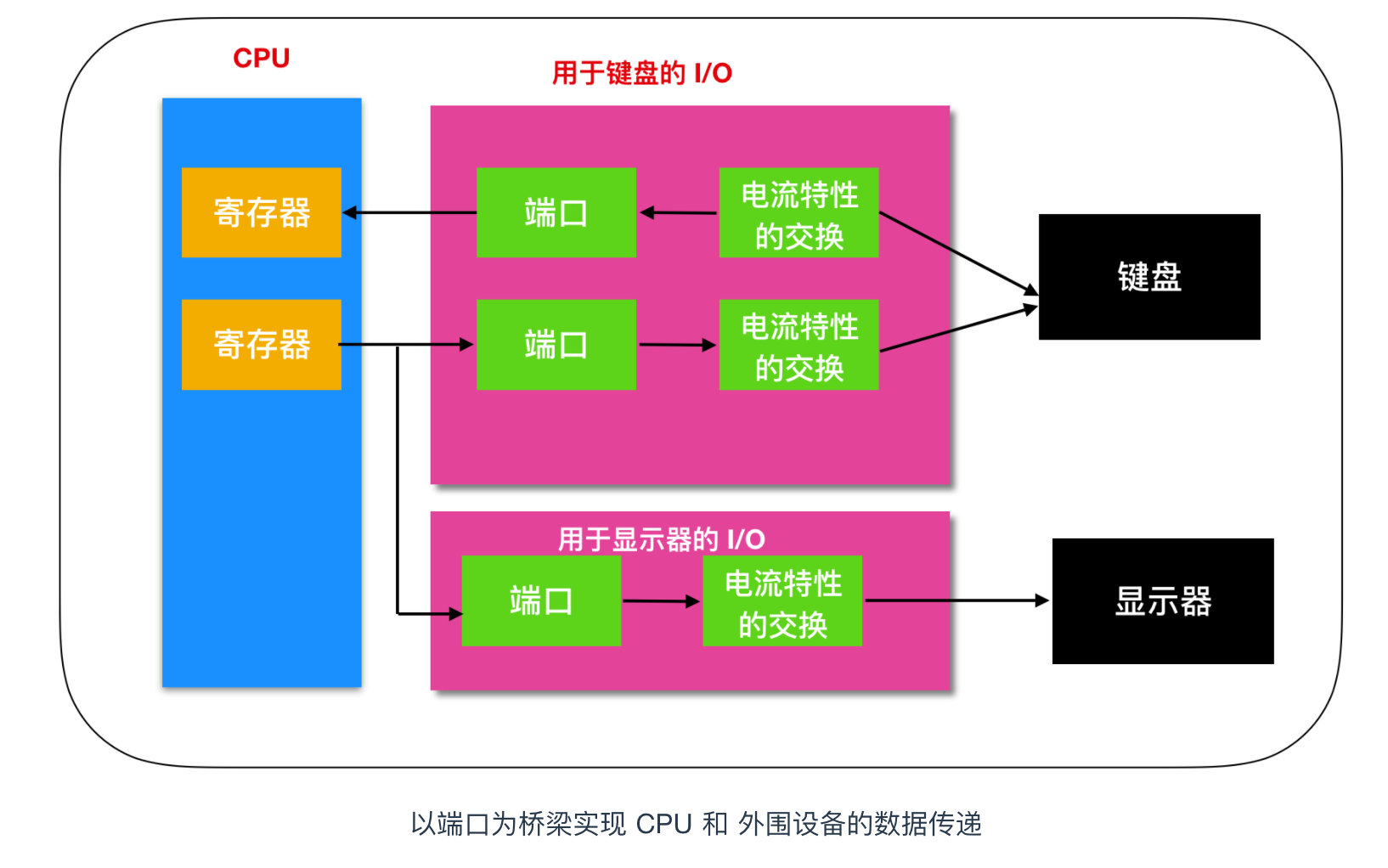 IO 是 Input/Output 的缩写。显示器、键盘等外围设备都有各自专用的 I/O 控制器。I/O 控制器中有用于临时保存输入输出数据的内存。这个内存就是 端口(port)。端口你就可以把它理解为我们上述说的 港口。IO 控制器内部的内存,也被称为寄存器,不要慌,这个寄存器和内存中的寄存器不一样。CPU 内存的寄存器是用于进行数据运算处理的,而IO中的寄存器是用于临时存储数据的。