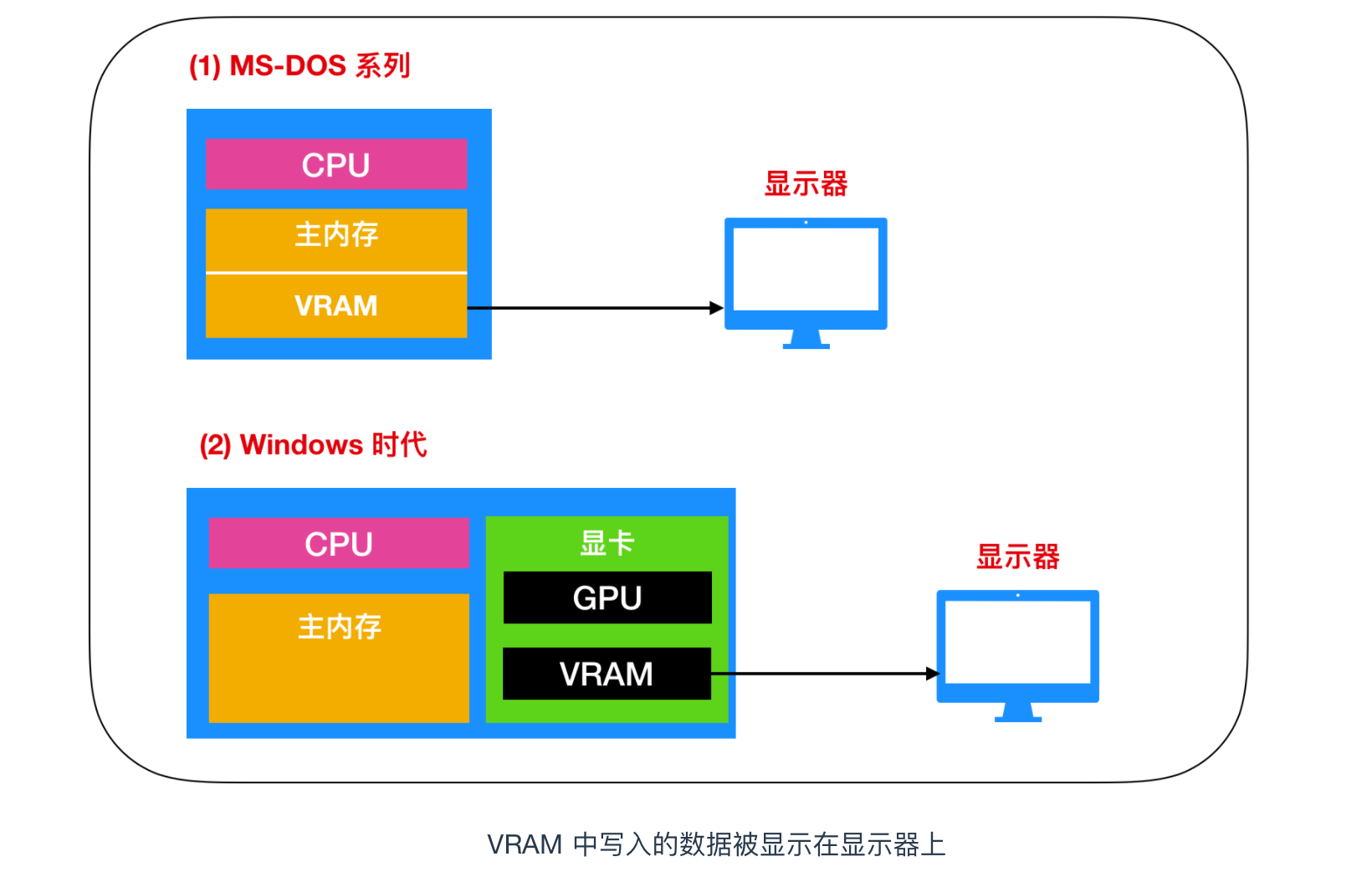 在 MS-DOS 时代,对于大部分计算机来说,VRAM 都是主内存的一部分。在现代计算机中,显卡等专用硬件中一般都配置有与主内存相独立的 VRAM 和 GPU(Graphics Processing Unit),也叫做图形处理器或者图形芯片。这是因为,对经常描绘图形的 windows 来说,数百兆的 VRAM 都是必需的。