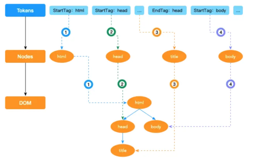 一边生成Token一边消耗Token来生成节点对象,带有结束标签标识的Token不会创建节点对象。节点对象包含了这个节点的所有属性 - 生成DOM树