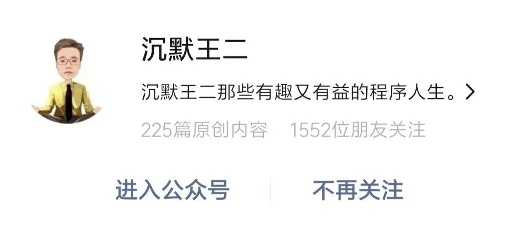 如果想要第一时间看到我更新的文章,可以微信搜索「沉默王二」,关注我的公众号,回复「java」再送你一份精选电子书大礼包,包含这十年来我读过的最优质的 Java 书籍。