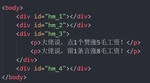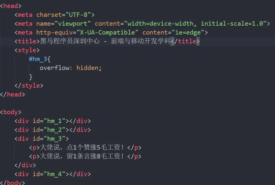 首先, body元素是1个BFC,因为它满足我们的第1个条件(body根元素),这个BFC区域包含子元素hm1234,但是不包括两个p标签,需要注意的是,hm3不是一个BFC区域,因为他不满足上面任意1个条件。如果我们希望hm3也是1个BFC区域,只要让hm3满足上面任意一个条件即可。