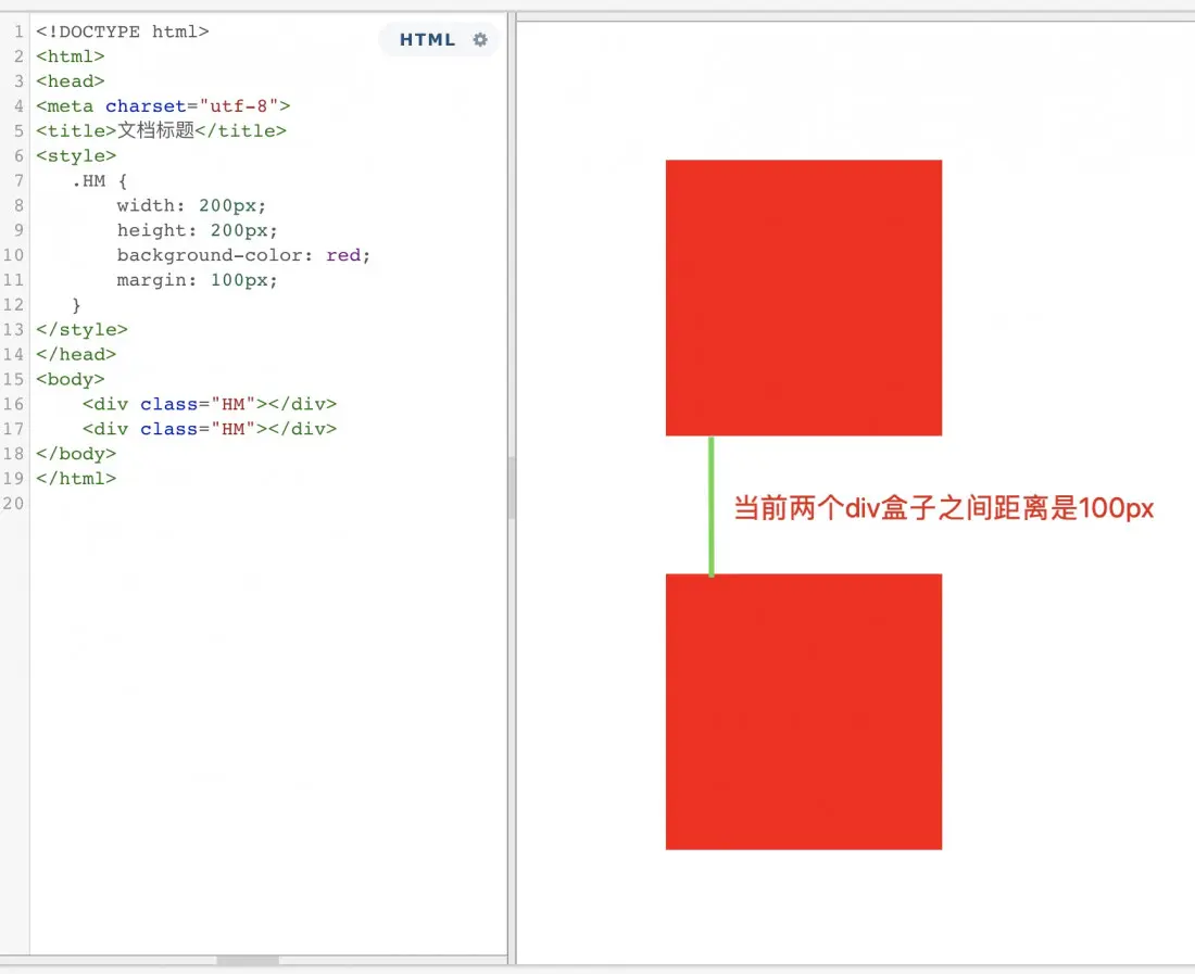 通过以上的实例,我们会发现,代码给两个div盒子,都添加了四个方向的margin,讲道理,学过数学的都知道,100+100=200.可是,盒子之间的距离,现在却之后100px。这就是很典型的margin的塌陷,两段margin重叠到了一块,互相影响。那么,如何利用BFC,让这个问题得到解决呢。回忆下,上文说过,BFC,就是一个与世隔绝的独立区域,不会互相影响,那么,我们可以将这两个盒子,放到两个BFC区域中,即可解决这个问题。