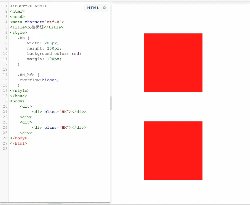 这个时候,hm3元素被设置为了overflow为hidden,满足上面第5个条件,所以此时,hm3就成为了一个BFC区域,这个BFC区域包含其所有子元素 – 两个p标签。