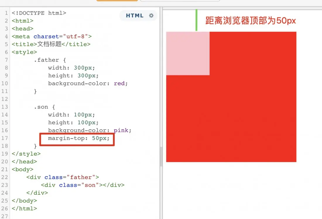 原本,正确的显示方式,应该是粉色盒子与红色盒子的顶部距离为50px,但是由于margin的塌陷问题,导致盒子内部的布局影响到了外部。这个时候,就可以触发BFC,将父盒子变成一个独立的区域,这样在BFC区域内部的任何操作,都不会影响到外部。