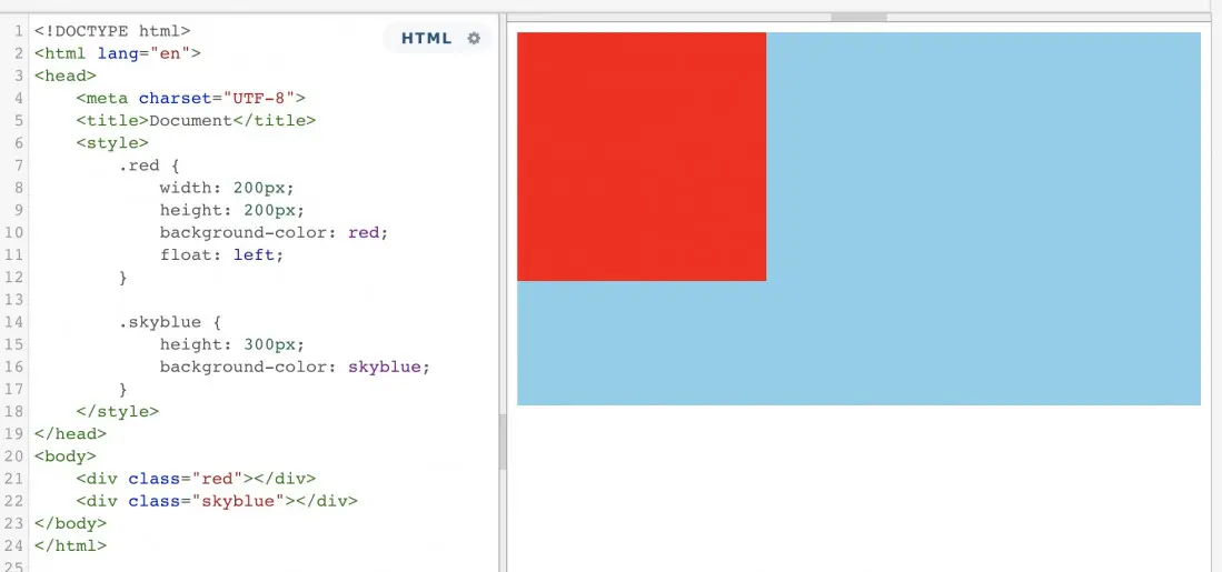 以上情况,红色盒子浮动,蓝色盒子时标准流,默认情况下,浮动元素覆盖了标准流元素。但是,如果将蓝色盒子的BFC触发,那么情况将有所变化。