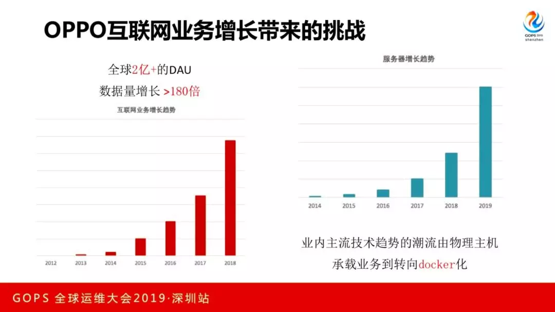 当前,OPPO在全球有超过2亿+的DMU,最近几年数据量增长超过180倍。从服务器数量和业务量的变化趋势,可以看到互联网业务整体的发展趋势是呈指数型上升,同时业务量的增长带来了服务器数量的高速增长,这也与业务指数曲线是类似的。而当下,业界主流技术已经从物理服务器承载业务转向了Docker化,Docker是当前热门的云计算主流技术。