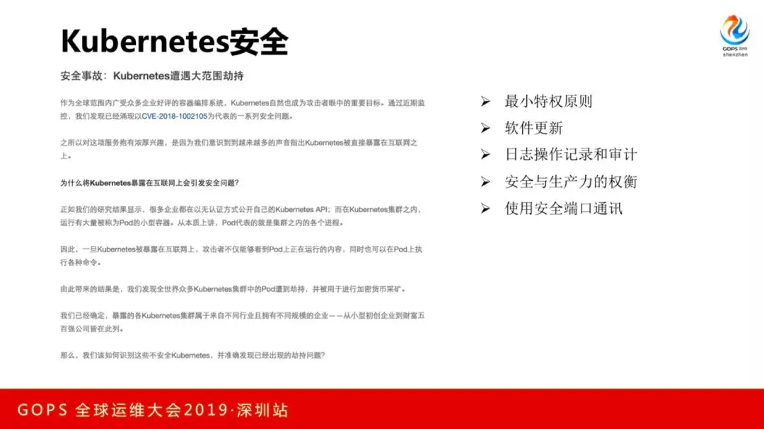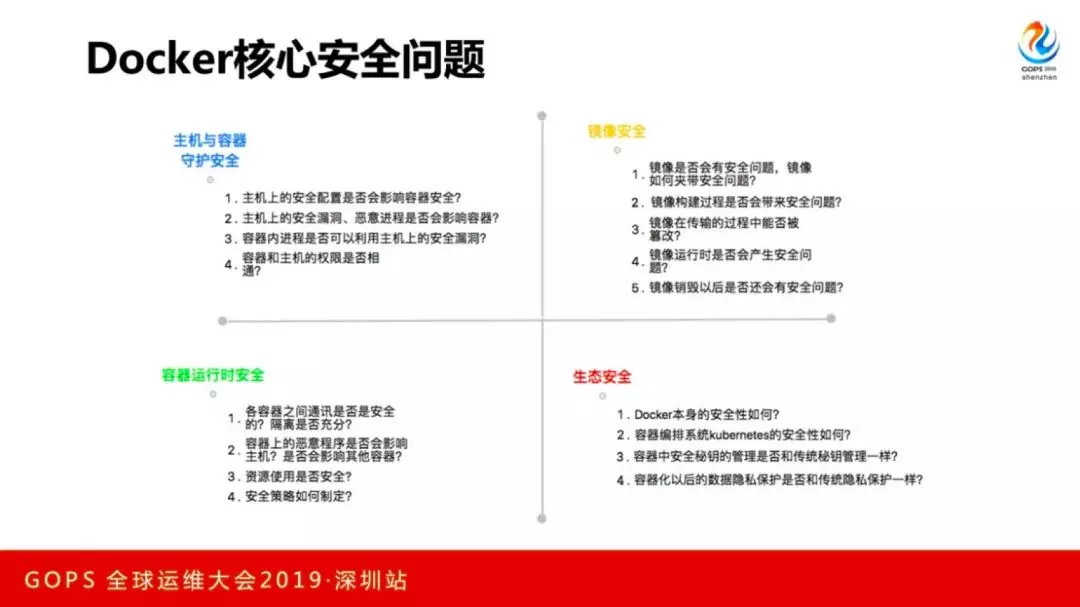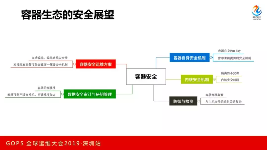 生态安全。主要是Docker本身的安全性,还有编排系统的安全问题,容器的秘钥管理和传统的秘钥管理是否不一样,容器化以后的数据隐私保护方案是否和传统方案一致。