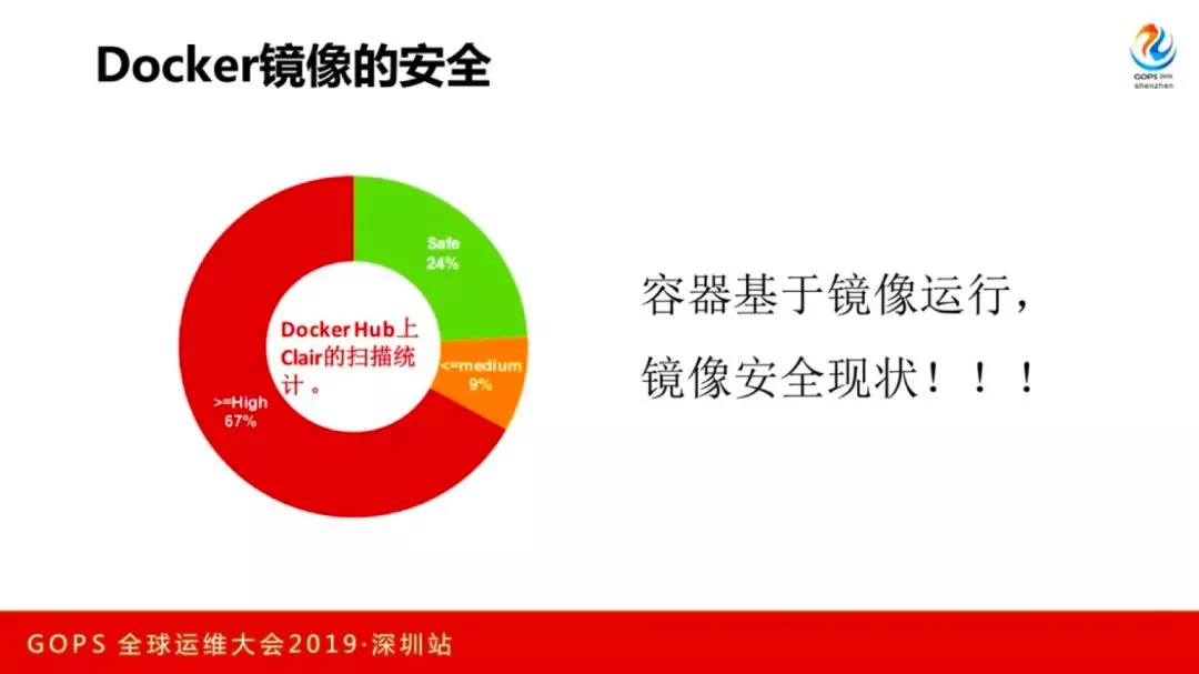Docker hub是在行业主流的镜像仓库,其由Docker官方提供。曾经有人对其镜像进行抽样,使用clair对镜像扫描,发现安全的镜像只有24%,而风险镜像占到76%,其中高风险的镜像有67%,这说明镜像已经成为Docker安全中的一个重要的安全攻击防御战场了。