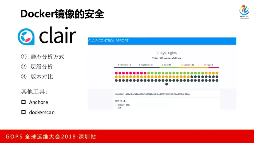 Clair:当下非常主流的镜像安全扫描工具,其扫描分析特点是使用静态分析方式,会把镜像包拆开,对镜像进行层级分析,和已知的CVE库进行版本对比的方式来扫描镜像。这种分析方式有很多局限性,只能根据CVE库的版本进行对比,换言之对0day是毫无防御能力,没有收录在CVE或其恶意库中的将得不到准确的扫描结果。所以扫描效果不是特别明显。