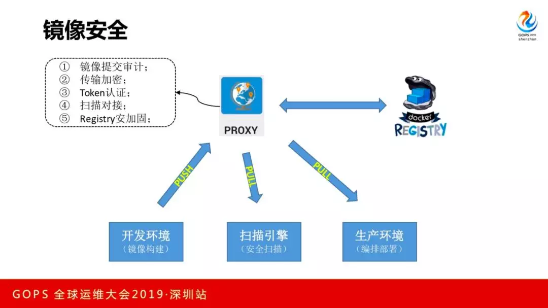 镜像仓库的架构中,一般仓库API不要直接对外提供服务,可以通过增加一个中间代理层proxy来负责所有访问对接,不论是在开发环境构建镜像还是扫描引擎对镜像进行安全扫描,还是产环境对容器进行编排部署都通过proxy进行来做镜像的操作审计,客户端认证、授权等操作。