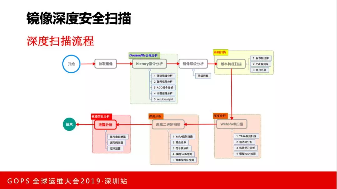 在版本特征扫描之后,会进入到深度扫描部分,包括webshell的深度扫描,例如使用yara规则,语法分析,大数据机器学习,模糊hash检测等;恶意elf文件的深度扫描,同样的,elf的扫描也有相应的yara规则,黑白名单,符号表分析,模糊hash,病毒、木马特征库检测;敏感信息检测,分析镜像各层中的文件,查看里面是否存在敏感信息,比如说是镜像里面写的有各类账号密码(如mysql/redis),我们会对其进行统一分析扫描,用于保护密码泄露,及早发现和预警。现在各类敏感信息泄露的事件层出不穷,敏感信息泄露也是我们非常关注的一个层面。这个就是整体的深度镜像扫描流程。