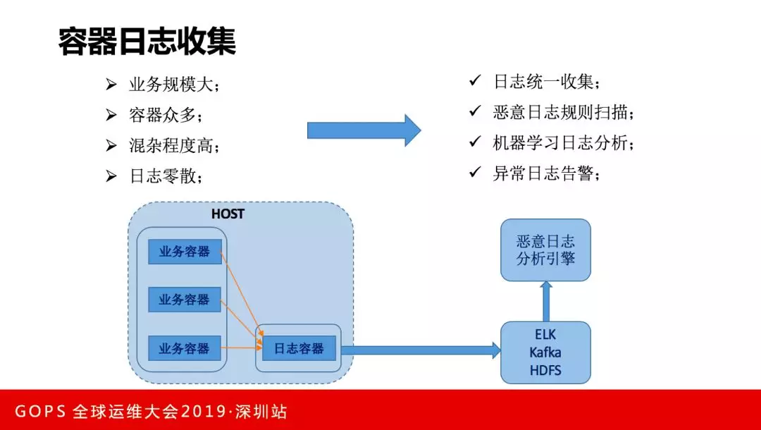 主机日志审计,需要有一套高效日志收集系统,统一日志规范,在主机上有统一的日志收集容器,不同的业务容器的日志统一收集发送到大数据平台,进行恶意日志分析,包括使用日志规则库进行恶意日志扫描,对恶意样本日志进行训练,使用机器学习方式做补充识别等业界主流日志分析方式。分析到异常日志对接到统一的安全预警平台进行容器安全预警。
